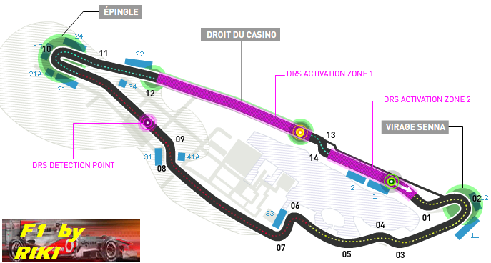 El GP de Canada 2014 contara con 2 zonas de DRS las cuales pueden verse en color morado en la presente grafica; el punto amarillo es el speed trap mientras que el verde es el Start/finsh.