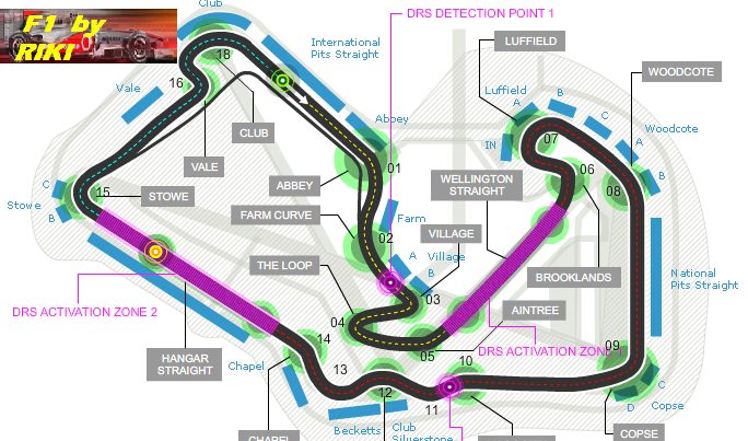 La FIA ha delimitado dos zonas de DRS para el proximo GP de F1, el GP de Gran Bretaña; en el esquema mostrado se pueden ver dos zona pintada de morado; en esas areas de podra activar el DRS, el punto verde indica el start/finish, mientras que el amarillo es la trampa de velocidad.